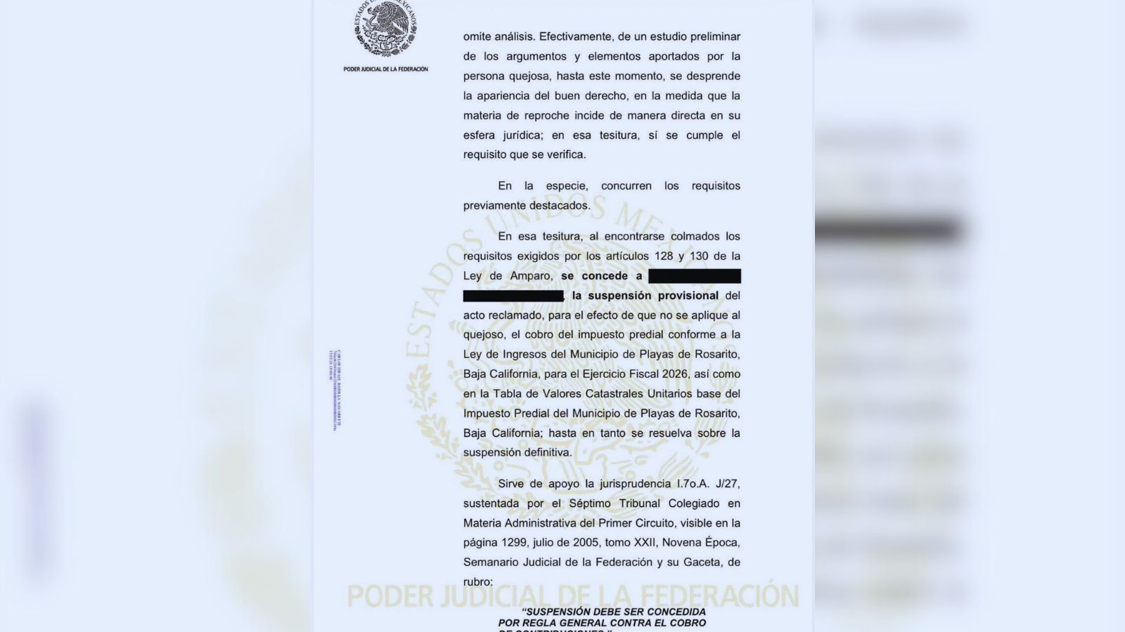 Juez federal otorga suspensión provisional por incremento del impuesto predial en Playas de Rosarito desde enero de 2026.