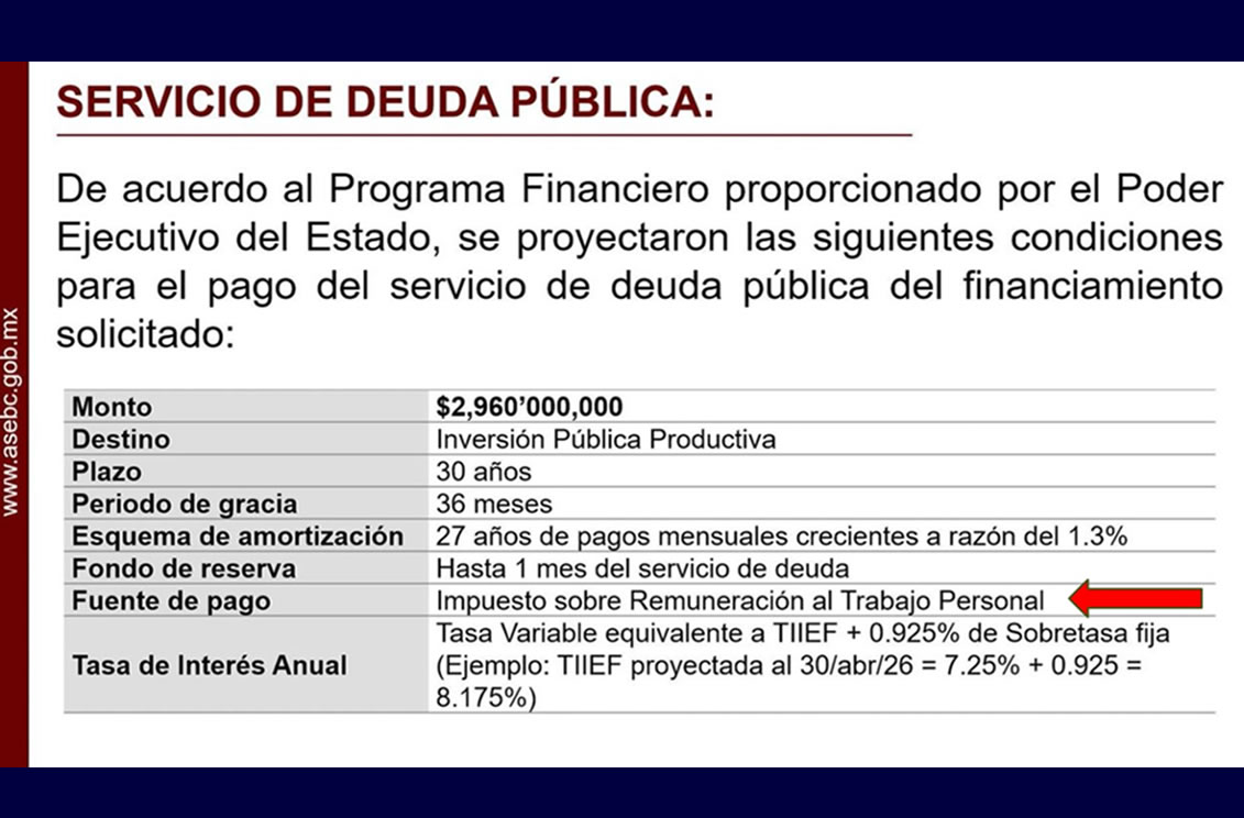MEXICALI.- La propuesta de que el gobierno de Baja California contraiga una deuda por 2 mil 960 millones de pesos para obras complementarias de la planta...